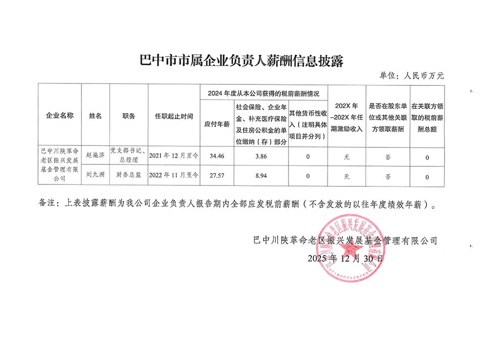 巴中市市屬國有企業(yè)負責人薪酬信息披露