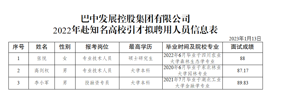 根據(jù)《四川省巴中市2022年赴知名高校引才公告》《巴中市國有資產(chǎn)監(jiān)督管理委員會關(guān)于印發(fā)<巴中市市屬國有企業(yè)機構(gòu)設(shè)置和勞動用工管理辦法(試行)>的通知》(巴市國資發(fā)〔2020〕67 號)等規(guī)定,經(jīng)網(wǎng)上報名、資格審查、面試、體檢等程序,現(xiàn)對符合崗位要求的張悅等3名擬聘用人員即日起進行公示(詳見附件)。