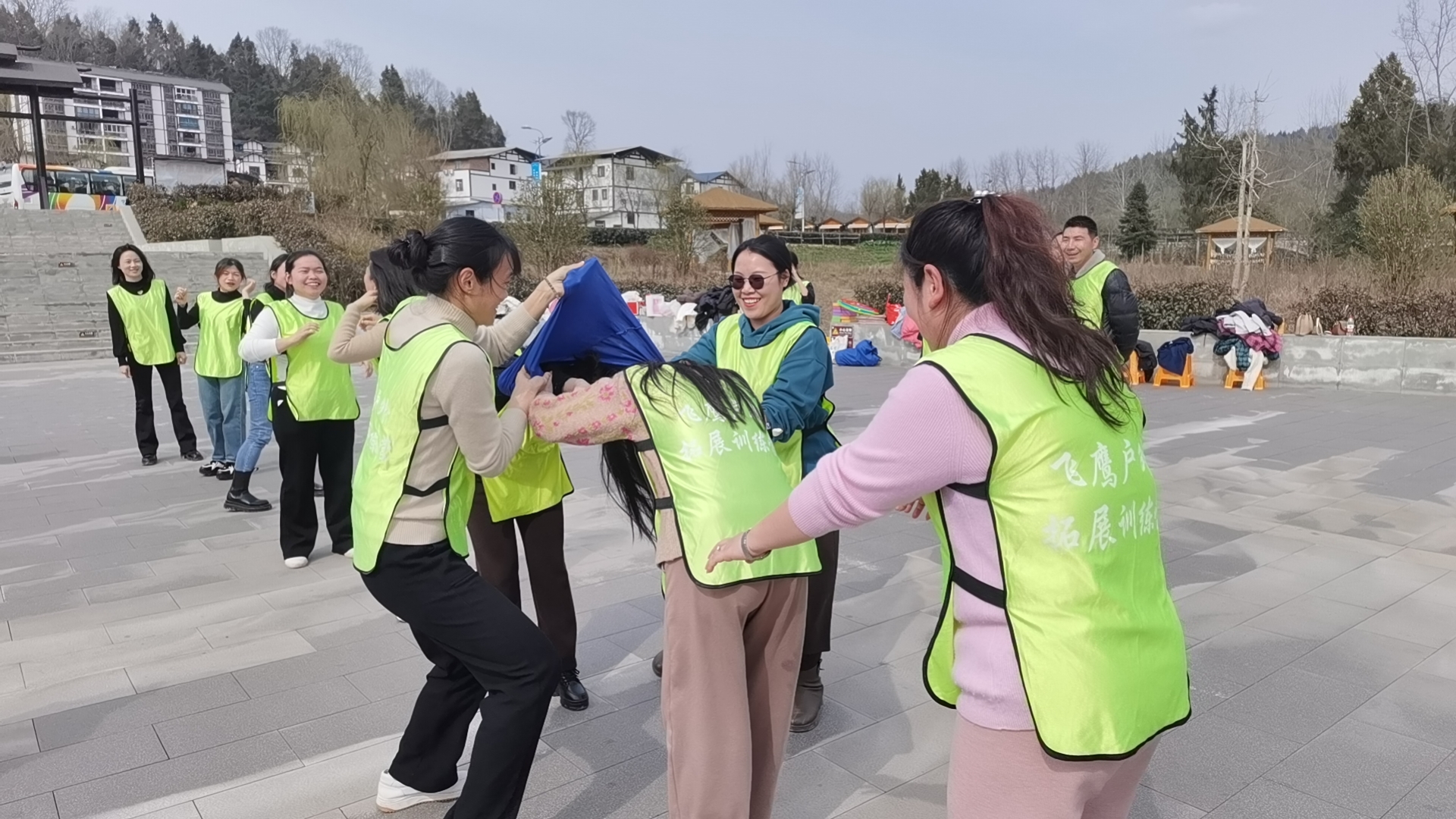 下午,女職工們?cè)隈嗰R水鄉(xiāng)碼頭廣場(chǎng)開(kāi)展了團(tuán)建活動(dòng)。活動(dòng)開(kāi)始前,教官按照?qǐng)?bào)數(shù)的順序,將全體參與人員隨機(jī)分成了紅、黃、綠3個(gè)隊(duì),隊(duì)員們通過(guò)進(jìn)行輪流交換揉肩、捶背等放松活動(dòng)打破隔閡、消除尷尬,營(yíng)造了歡快活潑的團(tuán)隊(duì)氛圍。