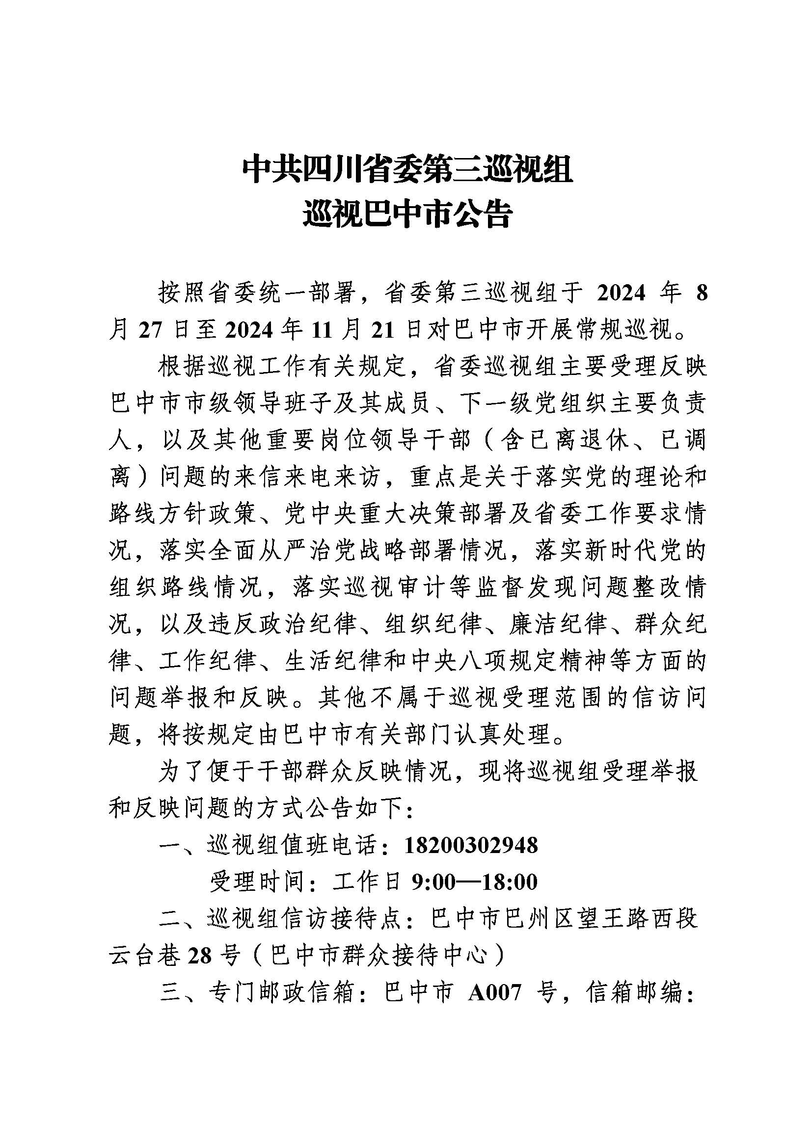 中共四川省委第三巡視組巡視巴中市公告