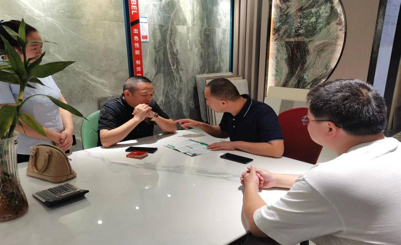 (圖為在黃家溝片區(qū)諾貝爾瓷磚賣場(chǎng)現(xiàn)場(chǎng)交流,宣傳創(chuàng)業(yè)擔(dān)保貸款政策)